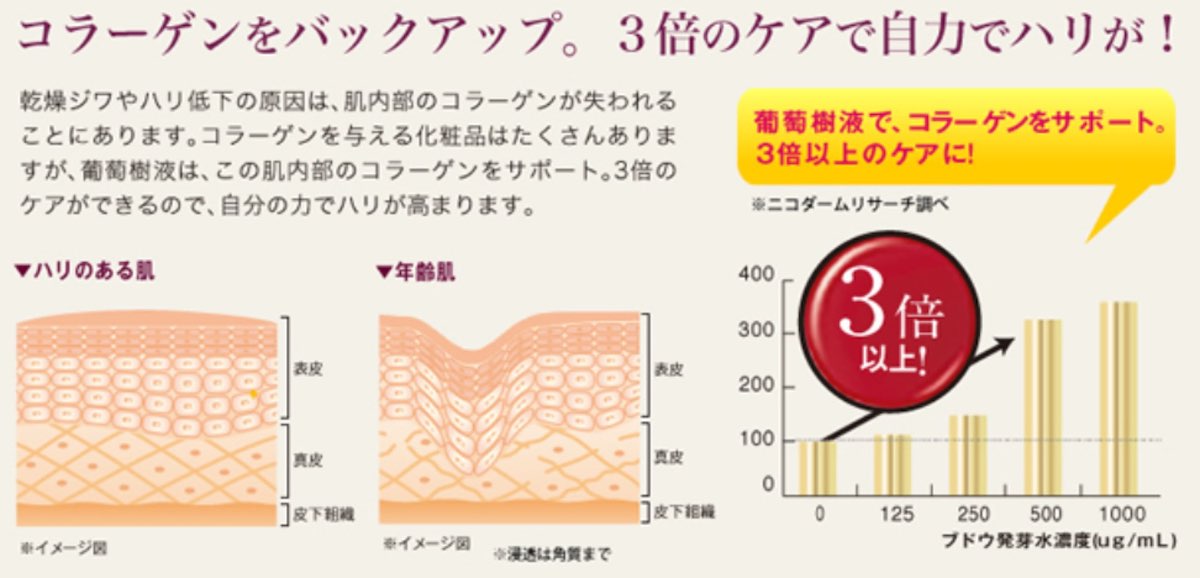 コラーゲンを3倍に高め、自ら潤う力をサポートするし、プリッと張った肌へ導いてくれます。その葡萄樹液が、世界で初めて化粧品成分となりました。
