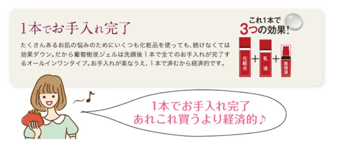 葡萄樹液ジェルは、これ一本で化粧水、乳液、美容液の3つの効果があるオールインワンタイプです。洗顔後、1本で全てのお手入れが完了するのでお手入れが楽なうえ、お財布にも優しくなっています。