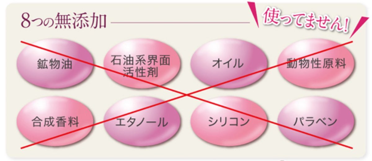 肌が敏感な人にも使えるよう、パラベン、シリコン、エタノール、オイル、合成香料、動物性減量、石油系界面活性剤、鉱物油の8成分を無添加にしています。